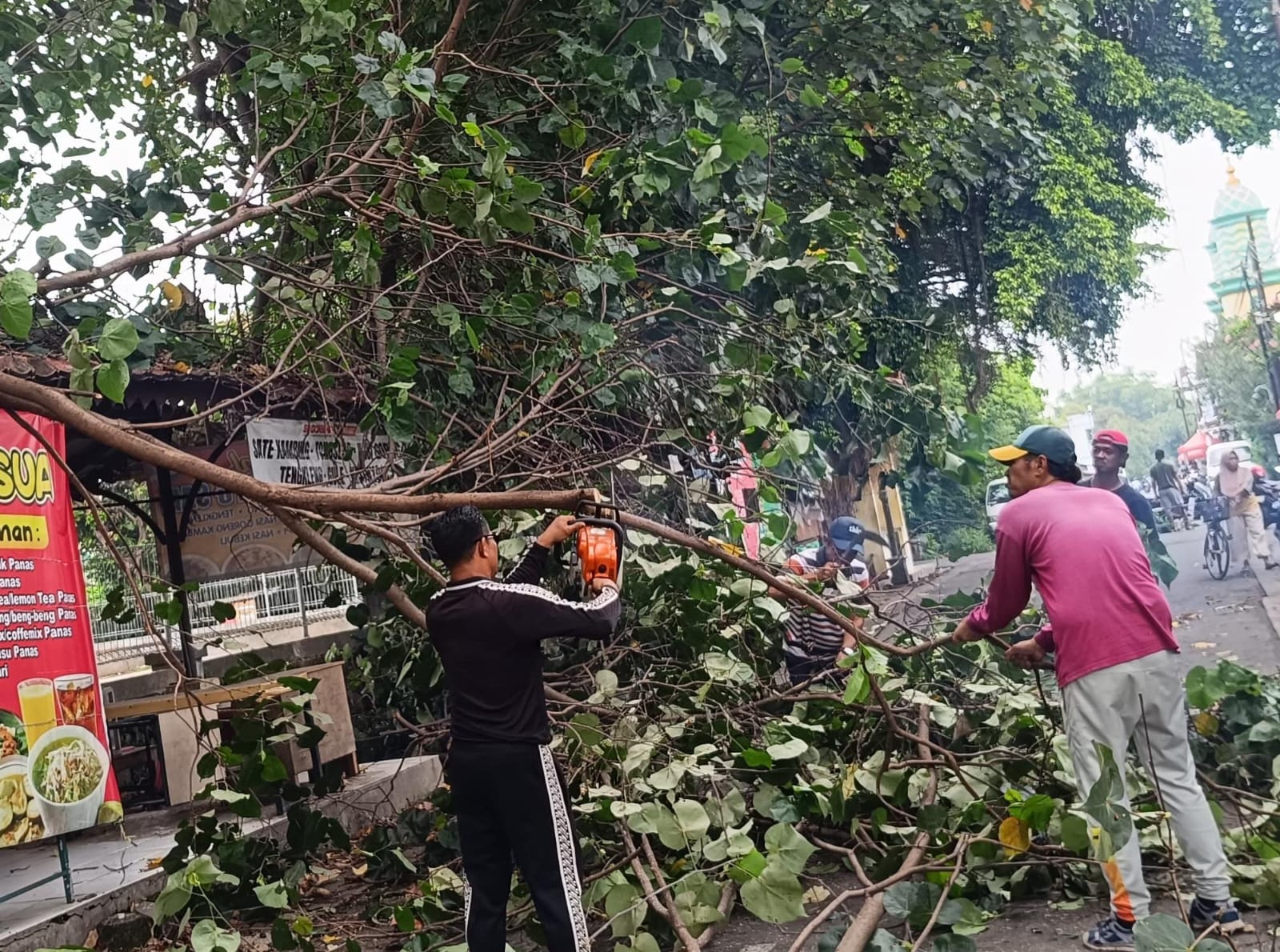 Bhabinkamtibmas bersama relawan, dibantu warga masyarakat sekitar, melakukan penebangan pohon waru yang berpotensi tumbang tersebut. Langkah ini dilakukan sebagai upaya pencegahan agar pohon tidak roboh dan membahayakan pedagang maupun para pengguna jalan yang melintas di sekitar lokasi.