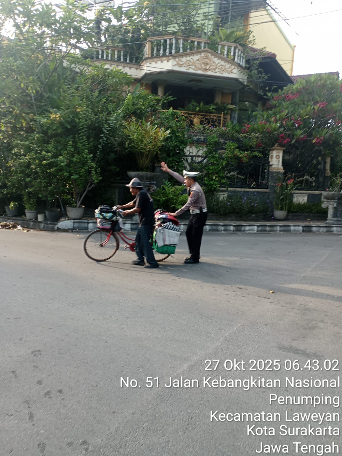 Polresta Surakarta- Polda Jateng – Di sela pelaksanaan pengawasan dan pengendalian (wasdal) kegiatan PH Pagi di Simpang Koni, Jalan Bhayangkara, Kota Surakarta, Ipda Tri Hindro Winarso, SH, selaku Kasubnit Regident Polresta Surakarta, menunjukkan kepeduliannya kepada masyarakat dengan membantu seorang pengendara sepeda yang mengalami ban bocor, Senin (27/10/2025).