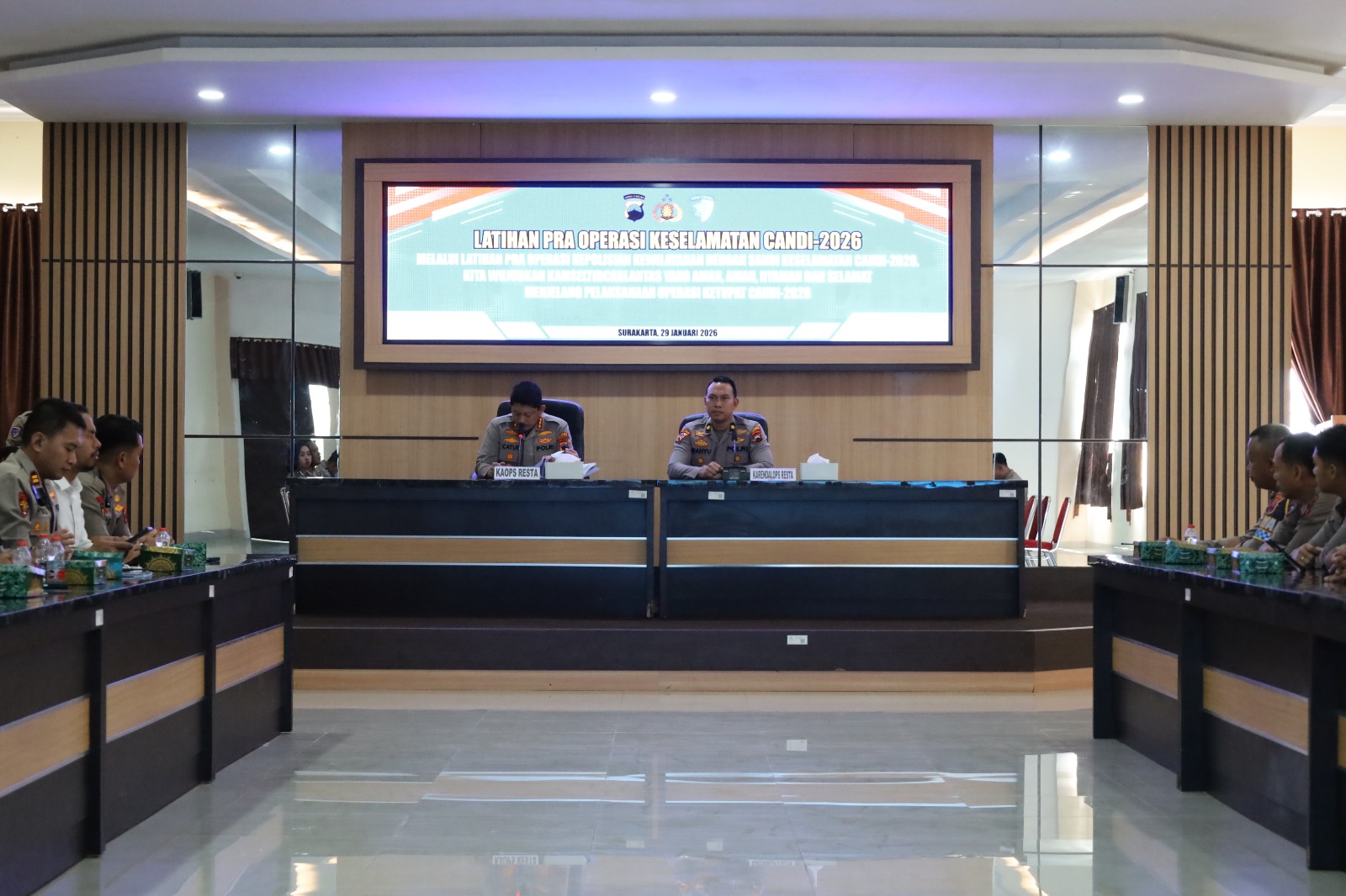 Polresta Surakarta- Polda Jateng-Dalam rangka memantapkan kesiapan personel menjelang pelaksanaan Operasi Keselamatan Candi 2026, Polresta Surakarta menggelar Latihan Pra Operasi (Latpraops) yang dipimpin langsung oleh Kapolresta Surakarta Kombes Pol. Catur Cahyono Wibowo, S.I.K.,M.H., Kamis (29/01/2026), bertempat di Aula Wirasatya96 Mapolresta Surakarta.