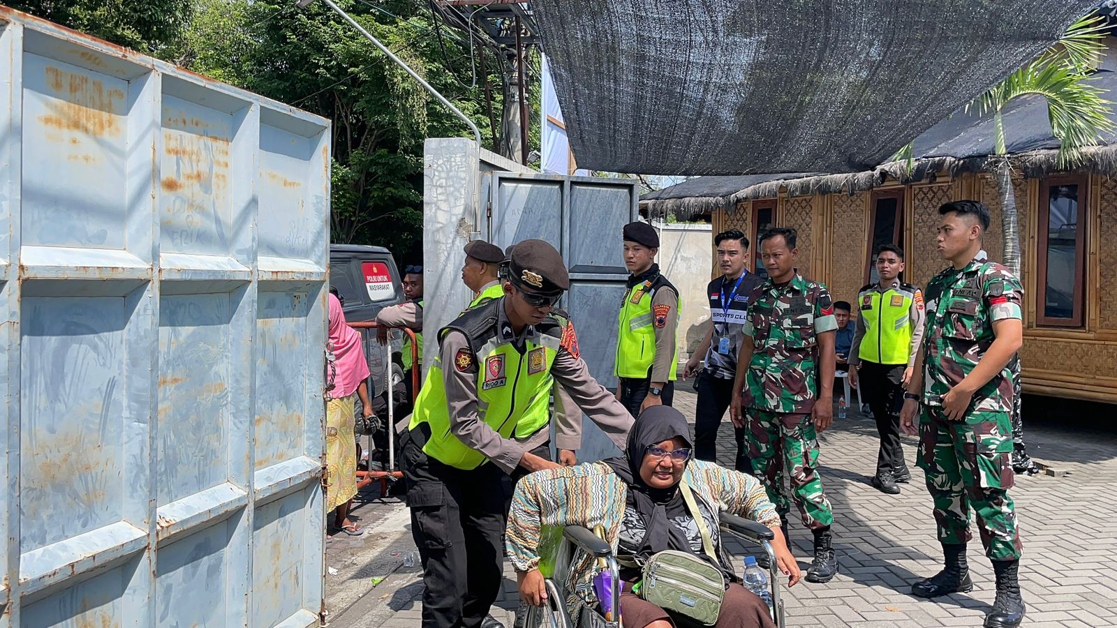 Polresta Surakarta – Polda Jateng– Personil Sat Samapta Polresta Surakarta menunjukkan kepedulian dan pelayanan humanis dengan membantu mendorong kursi roda seorang warga yang sedang ikut mengantri dalam kegiatan SHA Berbagi di kawasan Manahan Solo, Selasa (02/12/2025).