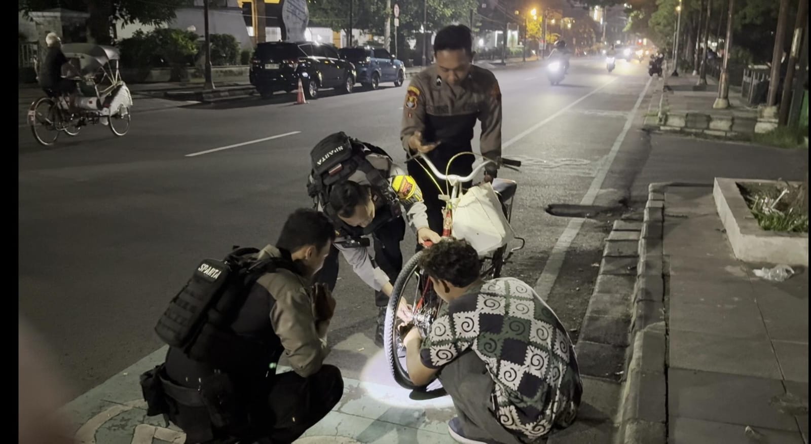 Melihat kondisi tersebut, personel Tim Sparta dengan sigap menghentikan patroli dan segera memberikan pertolongan. Petugas secara langsung membantu memasang kembali roda depan sepeda serta melakukan pengecekan dan perbaikan sederhana agar sepeda dapat kembali digunakan dengan aman.